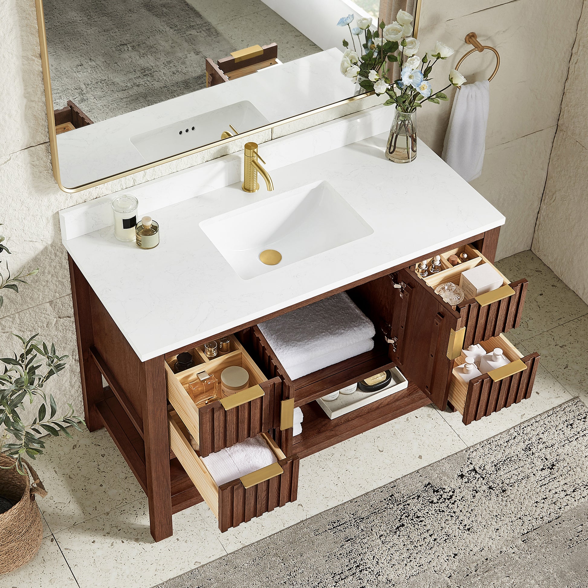 La vanité Winslow apporte une touche d’élégance intemporelle à toute salle de bain grâce à son design chaleureux en bois et ses lignes verticales raffinées. Son fini riche et ses accents dorés lui confèrent un style haut de gamme qui s’intègre aussi bien aux décors modernes qu’aux ambiances plus classiques. Disponible en 30", 48" et 60", elle offre une solution adaptée à tous les espaces, du plus compact au plus spacieux. Sa conception robuste et la qualité de ses matériaux assurent durabilité et performance au quotidien. Une pièce maîtresse qui allie esthétique, fonctionnalité et qualité.