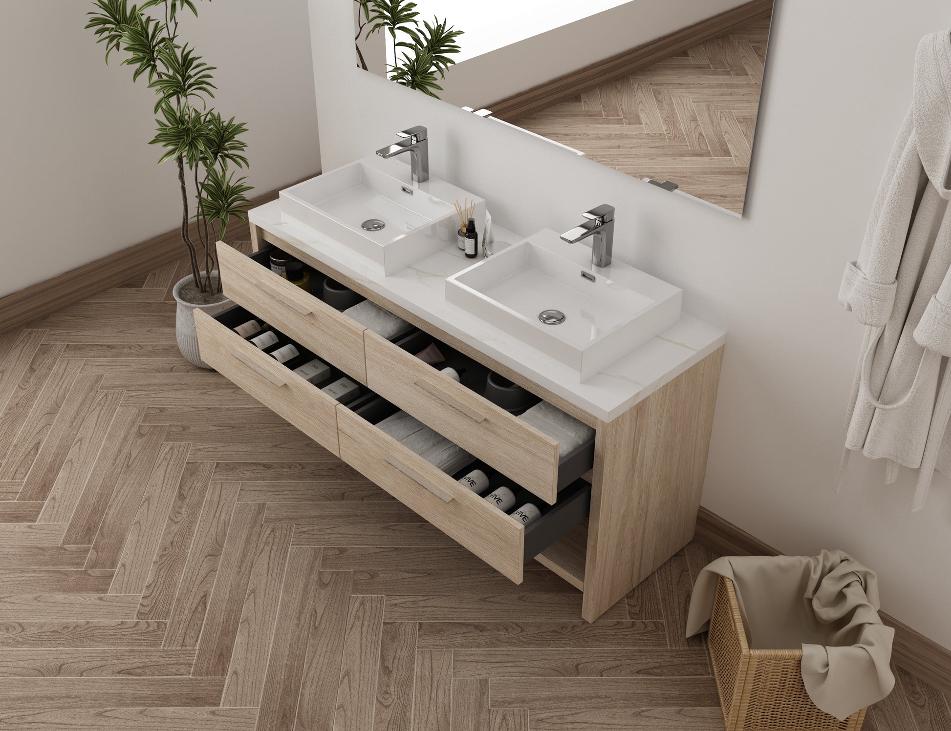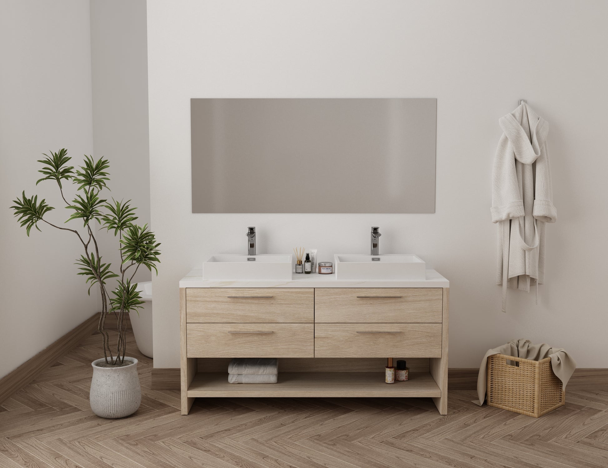 Découvrez Countryside, le meuble-lavabo de 152 cm (60 po) élégant et moderne, avec une finition effet marbre Chêne pâle, Blanc et Or. Doté de quatre tiroirs spacieux, il offre un grand espace de rangement pour tous vos essentiels de salle de bain. Son design moderne et tendance fait du Countryside un meuble remarquable qui rehaussera le style de toute salle de bain. Fabriqué avec des matériaux de haute qualité, ce meuble-lavabo est conçu pour durer et est facile à installer et à entretenir.