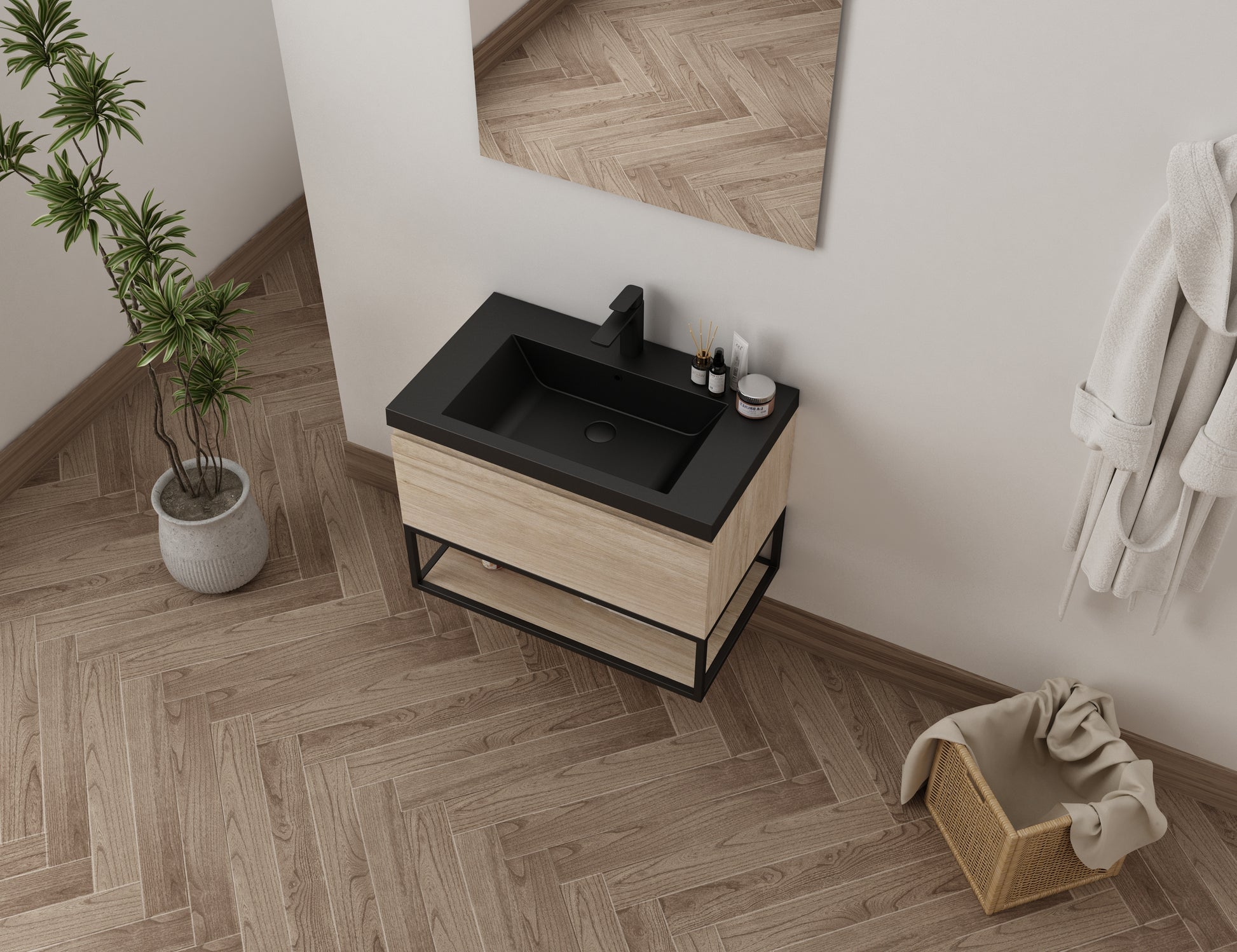 Firenze is a beautiful wall-mounted vanity that boasts a unique design. Featuring Chêne facades and a black frame, it exudes a rustic charm with a modern twist. With one drawer and an open storage space, it provides ample storage for all your bathroom essentials. The combination of Chêne and black adds an elegant touch. Upgrade your bathroom with Firenze and enjoy its practicality and timeless design.