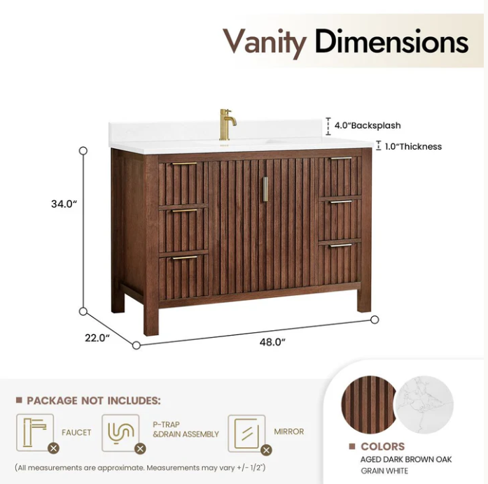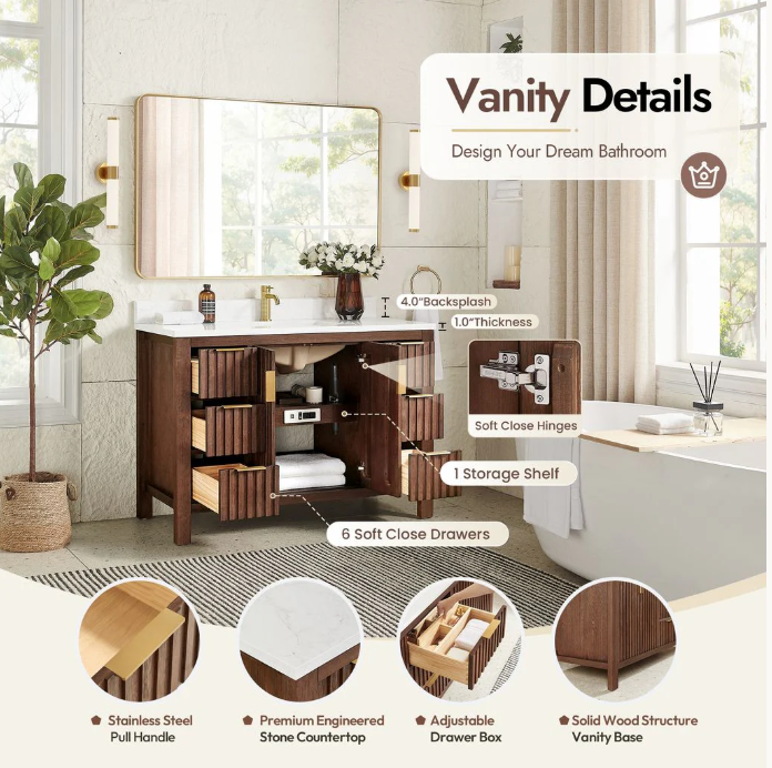 La vanité Winslow apporte une touche d’élégance intemporelle à toute salle de bain grâce à son design chaleureux en bois et ses lignes verticales raffinées. Son fini riche et ses accents dorés lui confèrent un style haut de gamme qui s’intègre aussi bien aux décors modernes qu’aux ambiances plus classiques. Disponible en 30", 48" et 60", elle offre une solution adaptée à tous les espaces, du plus compact au plus spacieux. Sa conception robuste et la qualité de ses matériaux assurent durabilité et performance au quotidien. Une pièce maîtresse qui allie esthétique, fonctionnalité et qualité.